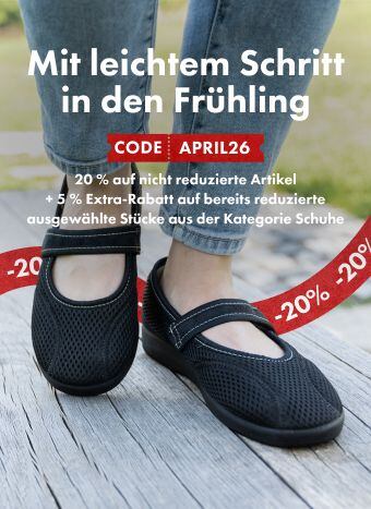 -20 % auf nicht reduzierte Schuhe und zusätzlich 5 % auf reduzierte Schuhe mit dem Code APRIL26 👟 Gilt für die Kategorien Frühlings- und Sommerschuhe, Turnschuhe und Gesundheitsschuhe